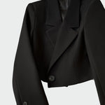 Минималистичен кратък сако с елегантен дизайн и модерни детайли. Яката с остри линии и предното закопчаване придават динамичен характер, докато краткият крой е идеален за стилни проявления. Лесно се носи в бизнес, но и вечерни поводи.