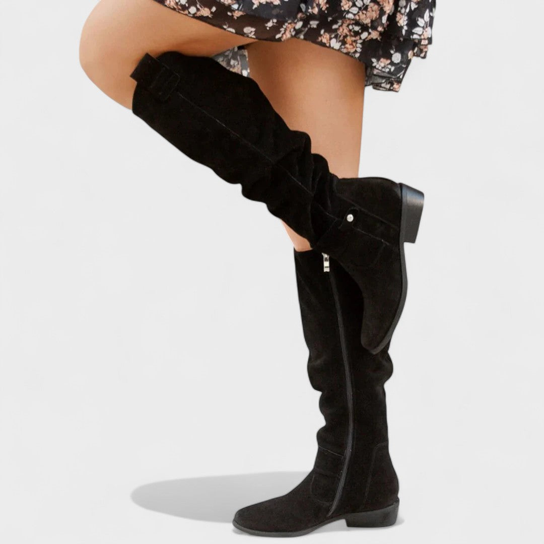 Тези високи ботуши носят градски шик и комфорт в една стъпка. Мекото, леко горнище с елегантни намачквания приляга плътно към крака и предлага отпуснат, изискан вид. Страничният цип позволява бързо обуване, докато ниските блокове ток предлагат стабилност за целодневно носене. Субтилни детайли като декоративна катарама придават доза изтънченост, която лесно се съчетава с рокли, поли или дънки. Перфектни за работа, кафе в града или вечерно излизане.