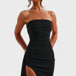 Вечерна Рокля Ефект Импакт е създадена за тези, които искат да оставят следата на всяко събитие. С безрамков дизайн, тесен крой и стратегическо набръчкване, подчертава извивките с изисканост. Дълбокият разрез с ефирен опашка създава движение и стил при всяка стъпка. Идеална за отличен повод, където елегантността и блясъкът са задължителни.