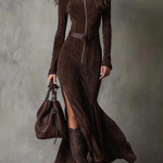 Открийте Виктория – дългата рокля, която празнува женствеността с грация и характер. Изработена от изкуствена кожа тип велур в топъл кафяв цвят, тя съчетава мекота и кадифен допир с плавен силует, който подчертава фигурата естествено. Предният цип и регулируемият колан дефинират талията със финес, докато дълбоката странична цепка придава движение и елегантна доза чувственост. Перфектна както за дневни събития, така и за специални вечери, Виктория превръща всяка ситуация в момент на чист стил.