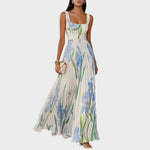 Дълга рокля, която съчетава романтика и изтънченост. Квадратен деколте с широки презрамки, който със сигурност подчертава деколтето, дефинираната талия оформя фигурата, а плисираната пола придава плавно падане, което следва всяка стъпка. Изработена от лека, еластична материя за целодневен комфорт, с ботанически мотив, който внася свеж, шикозен вид. Идеална за сватби, вечери, пътувания и събития на открито — визията е готова със сандали и клъч чанта.
