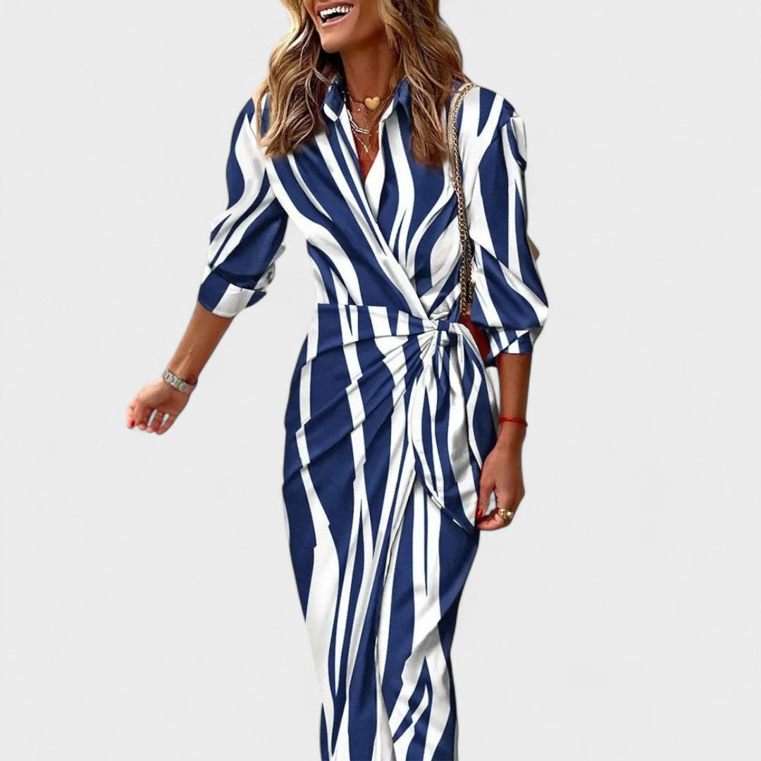 - Ласкав крой: удължава фигурата и подчертава талията без стягане.