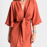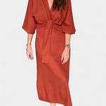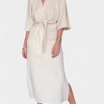 Семплост, който очарова със силует, създаден, за да подчертае естествено. Роклята Наталия комбинира дълбоко V-образно деколте с кимоно ръкави и централен възел, който нежно акцентира върху талията. Нейната структурирана тъкан и функционален дизайн са универсална и елегантна основна рокля.