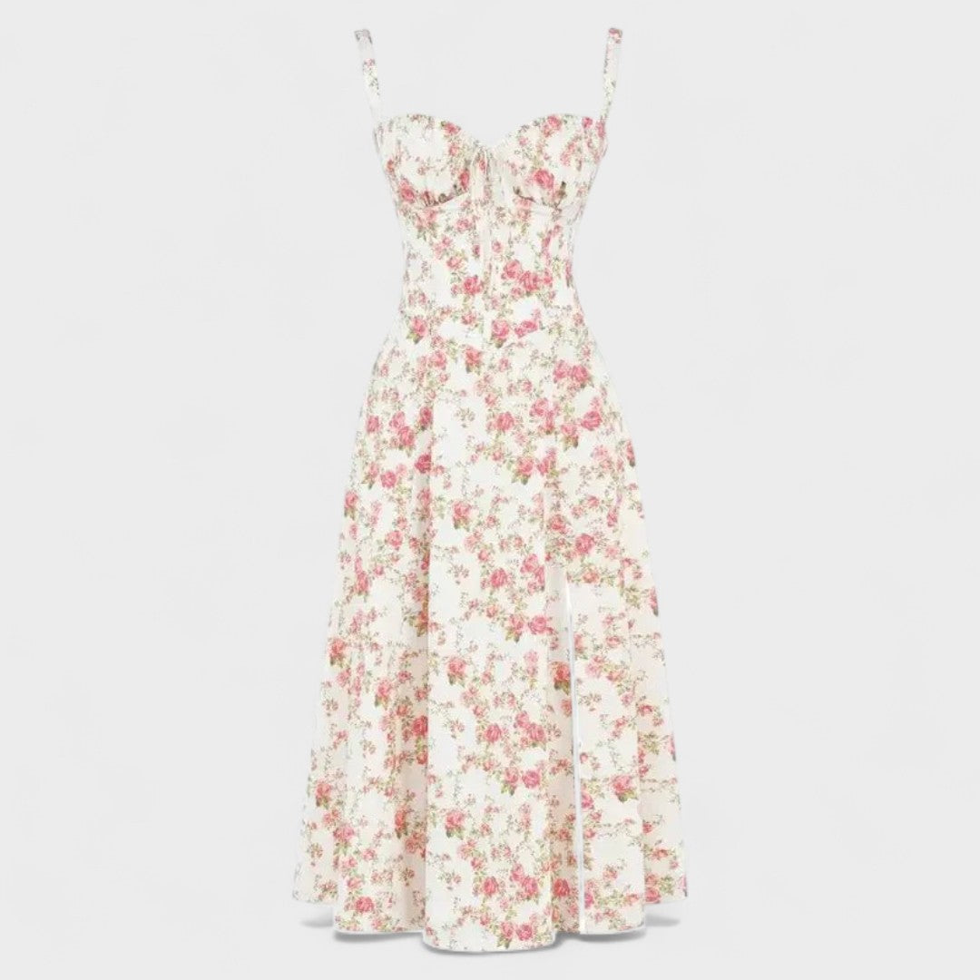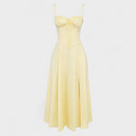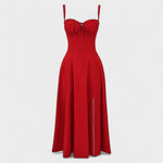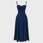 Тази женска миди рокля се отличава с перфектен крой, който подчертава силуета и придава изискан вид. Елегантната корсетна горна част с презрамки и дискретни детайли придава изтънчено усещане, докато деликатният разрез в долната част добавя нотка на сексуалност и свобода на движението. Идеален е за достойни поводи, вечерни излизания или романтични моменти, в които искате да се блеснете.