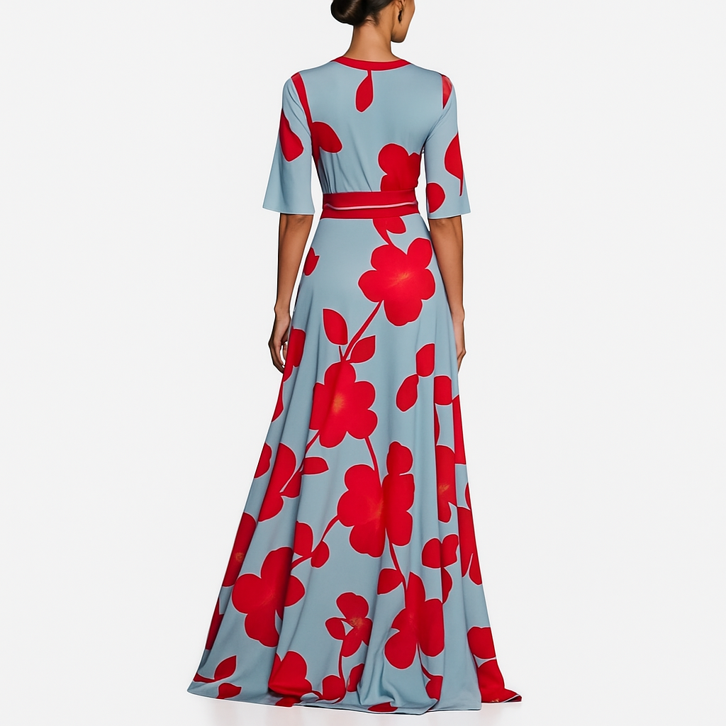 Забележителна макси рокля с дълбоко V-образно деколте и кимоно ръкави, създаваща изискана, издължена силуета. Подчертаният колан определя талията, докато разкошната, летящата пола с преден разрез придава драматично движение при всяка крачка. Практическите странични джобове са дискретно скрити в шева за доза ежедневна функционалност. Идеална за сватби, коктейли и всички оценени поводи, когато искаш да изглеждаш уникално.