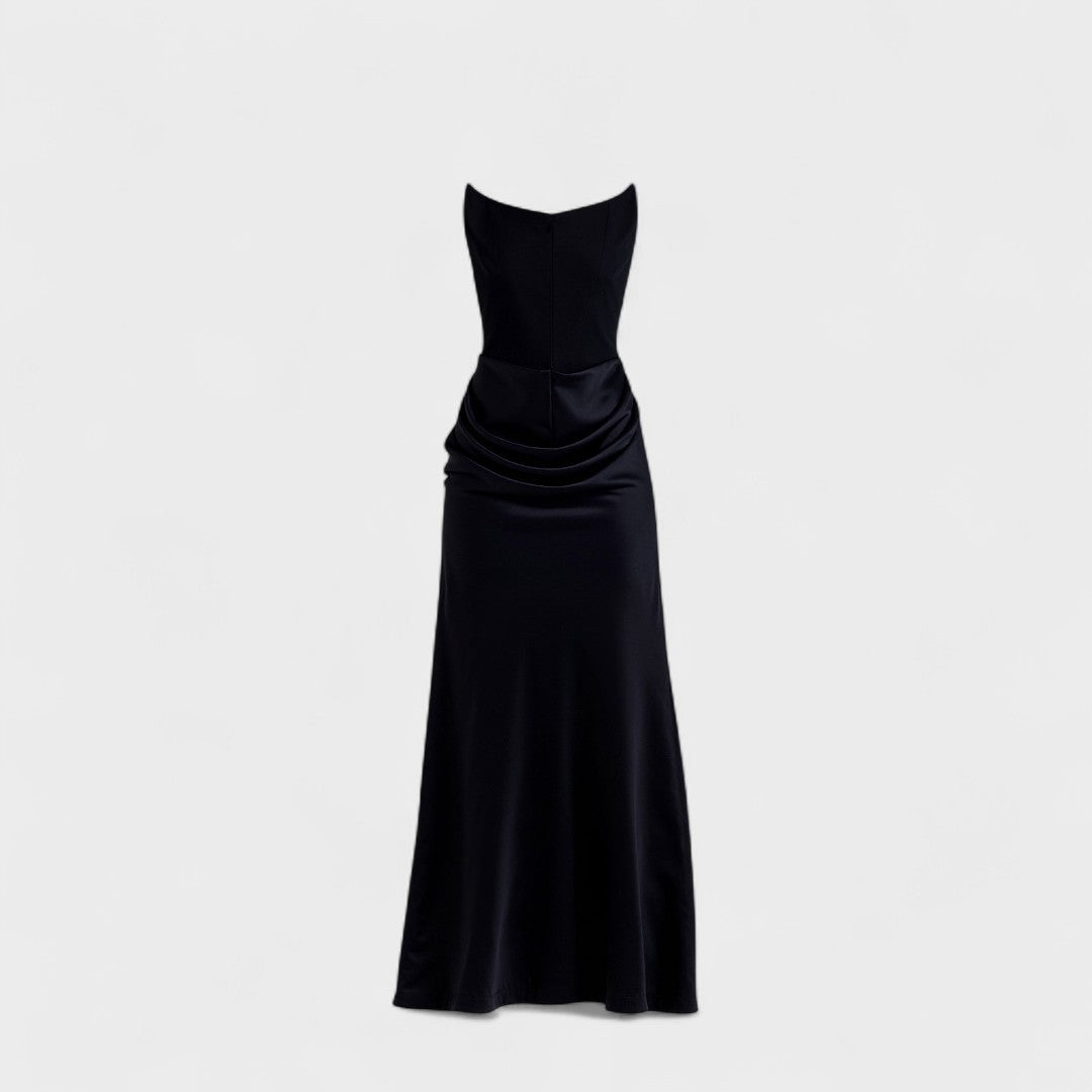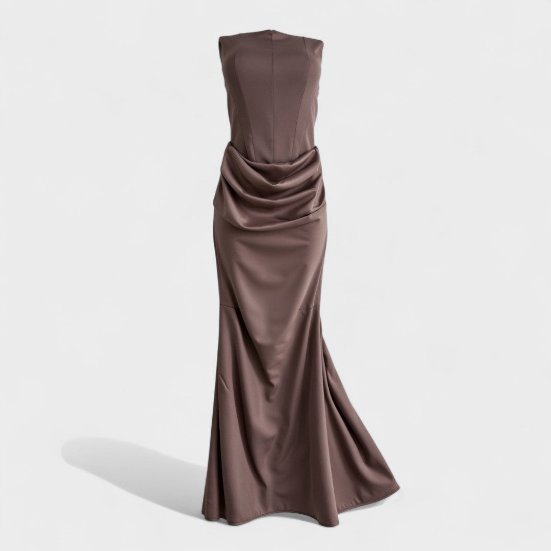 Роклята 'Радмила' представлява временно елегантен стил в най-красивия си вариант. Тази рокля, която артист достига до пода, има корсетен стил без презрамки, изработена от материя, която предоставя перфектна основа, докато наборът в областта на бедрата създава завидни форми. Персонализираният силует преминава в деликатно разширяване на рибешката опашка от лъскав сатен, която прави всеки стъпка специален.