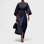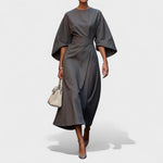 Рафинирана дълга рокля с лодка и обемисти ръкави изгражда изискана, архитектурна силует. Широкият колан подчертава талията, докато разкошната падаща пола позволява свобода на движението и грациозна походка. Минималистичните детайли и чистите линии са идеален избор за тържествени поводи, бизнес събития и вечерни излизания.