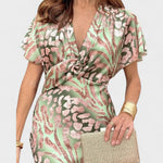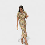 Софистирана миди рокля с ефирни ръкави и драпирано V-образно деколте, което нежно подчертава деколтето. Тъканта с изискан блясък и декоративен мотив елегантно пада върху тялото, докато дефинираният талия оформя женствена силуета. Завършекът, който леко се разширява, позволява грациозно ходене — идеално за сватби, коктейли и всякакви ценни поводи.