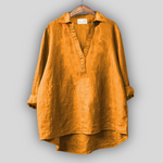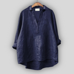 Елегантна ленена блуза в бяло, която излъчва свежест и вечен стил. Има V-изрез с дискретно закопчаване, дълги ръкави, които могат да се навиват, и асиметричен край с по-дълга задна част, осигуряващ комфорт и лекота на движението. Идеалният избор за стилни летни комбинации или елегантен ежедневен вид.