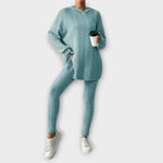 Този комплект от ребрист трикотаж е идеален избор за тези, които са практични с нотка елегантност. Персонализираният крой и увеличената дължина на блузата създават модерен вид, перфектен за носене вкъщи, за работа или на неформални излети.