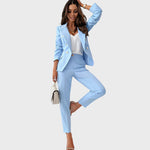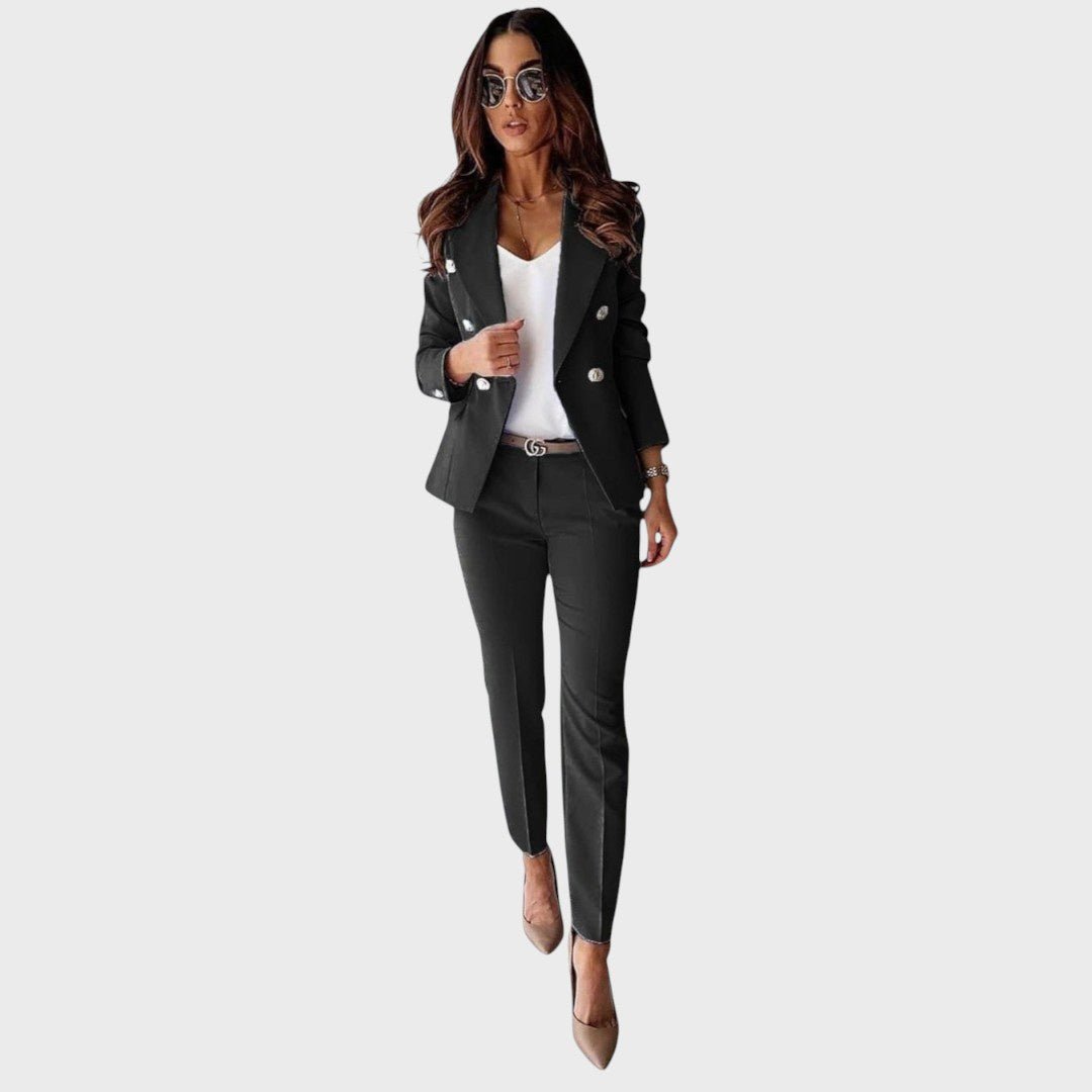 Божена дамско сако олицетворява класическа изтънченост с модерен привкус. Двуредният дизайн на сакото с елегантни метални копчета и перфектно съчетани панталони създават остър, изразен вид, който излъчва самочувствие и елегантност. Независимо дали в офиса, на бизнес срещите или на вечерните тържествени събития – Божена гарантира безупречен силует и изискана публика.