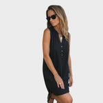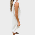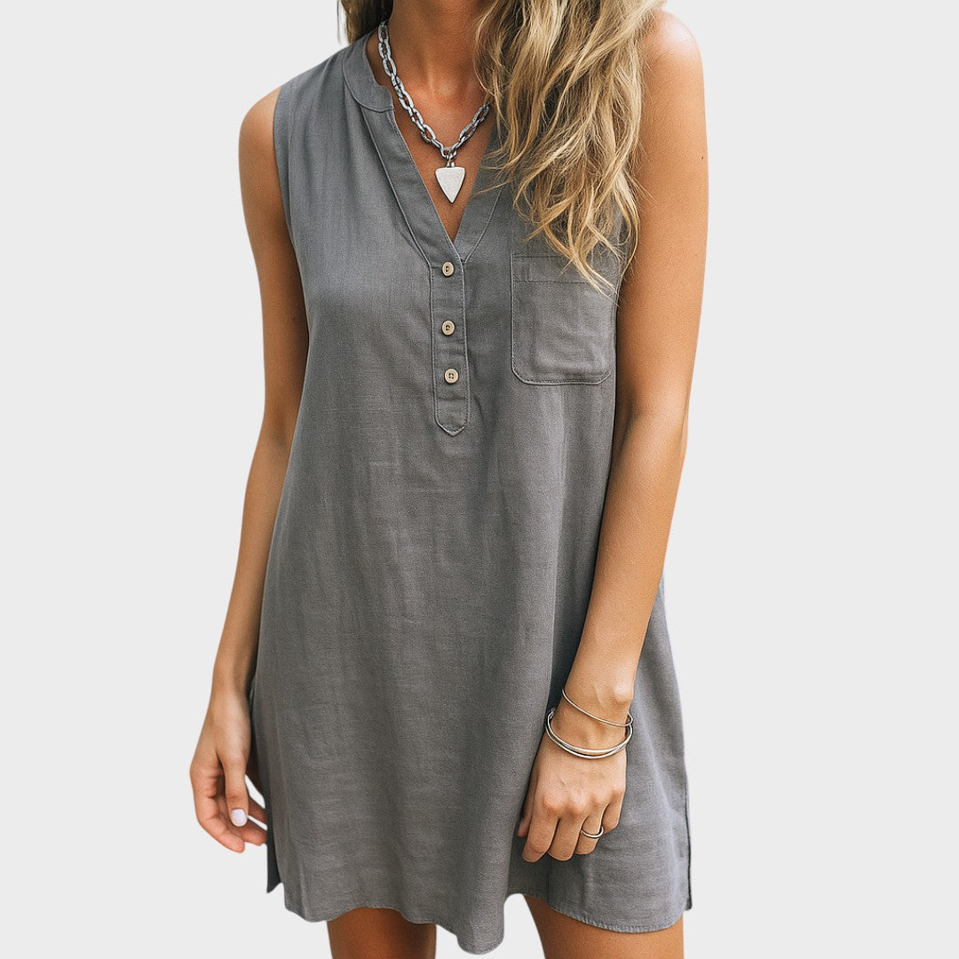 Този лек и проветрива рокля е перфектният избор за топли дни. Без ръкави, с модерен V-образен деколте и декоративни копчета, предлага комфорт и проста елегантност. Практичен джоб пред добавя специален детайл и прави още по-функционален. Идеален е за разходки, почивка или неформални срещи с приятели.