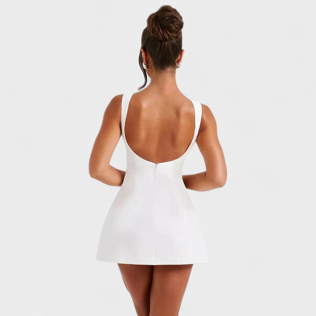 Тържествена мини рокля с А-образен силует и лодковидно деколте
