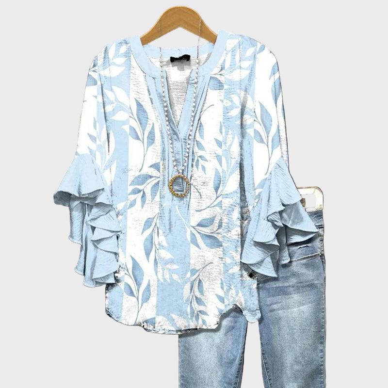 Освежете летния си стил с тази блуза в синьо, украсена с елегантни бели листа. Романтичните детайли на ръкавите с волани добавят движение и женственост, докато удобният крой предоставя лекота и елегантност за всеки момент от деня.