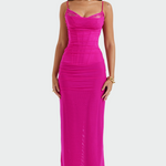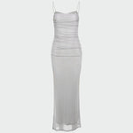 Впечатляваща макси рокля с тънки презрамки и дантелени детайли на деколтето. Нейната тясна силуетна форма подчертава извивките, докато прозрачната материя в долната част придава въздушна елегантност. Идеална за вечерни излизания и оценени поводи.