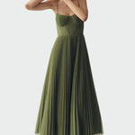 Елегантна и женска рокля с тънки презрамки и тесен корсет, който подчертава силуета. Плисираната пола до миди дължина предлага уникално движение и вечна елегантност. Идеална за елегантни поводи, от сватби до официални събития.