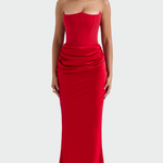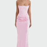 Импозантна и сексуална рокля с корсет без презрамки и тесен крой, който подчертава силуета. Детайлът с елегантен набръчкан колан придава женственост и уникален флуид, докато максималната дължина осигурява вечна елегантност. Идеална за тържествени вечери и блестящи изяви.