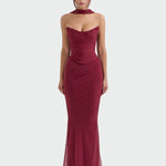 Елегантна и забележителна рокля без презрамки с прилепнал силует, който подчертава фигурата. Драпираните детайли на деколтето и връзване в стил корсет в талията добавят женственост и лукс, докато максималната дължина предлага безвременна изтънченост. Идеална за вечерни излизания и тържествени поводи.