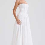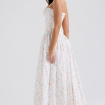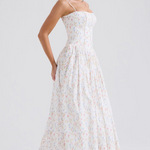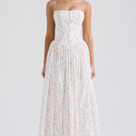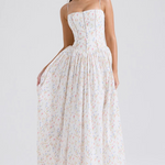 Елегантна цветна рокля, която подчертава женствеността с романтични нюанси. Пригоденият корсет с вертикални шевове акцентира върху силуета, докато широката пола осигурява комфорт и движение. Идеална за пролетни и летни поводи, от ежедневни разходки до елегантни покани.