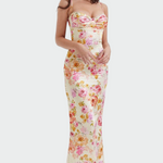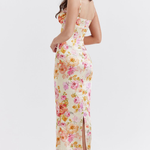 Импозантна макси рокля с цветен десен, която излъчва женственост и елегантност. Нейното тясно кроене подчертава силуета, докато деколтето с тонки презрамки придава усещане за деликатна привлекателност. Парче, което съчетава романтика и лукс, идеално за оценени поводи.