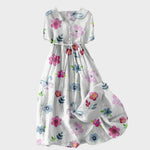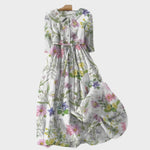 Дълга рокля с къси ръкави съчетава непринуден характер на ризата с романтичен обем на полата. Яката с фин ръб и редицата копчета придават изискан вид, докато връзката в талията лесно се адаптира прилягането. На събраната полата се създава плавен спад, който красиво следва всяка крачка. Изработена е от лек, въздушен материал, приятен на кожата, така че е идеална за разходки от града, излети и всички неформални поводи.