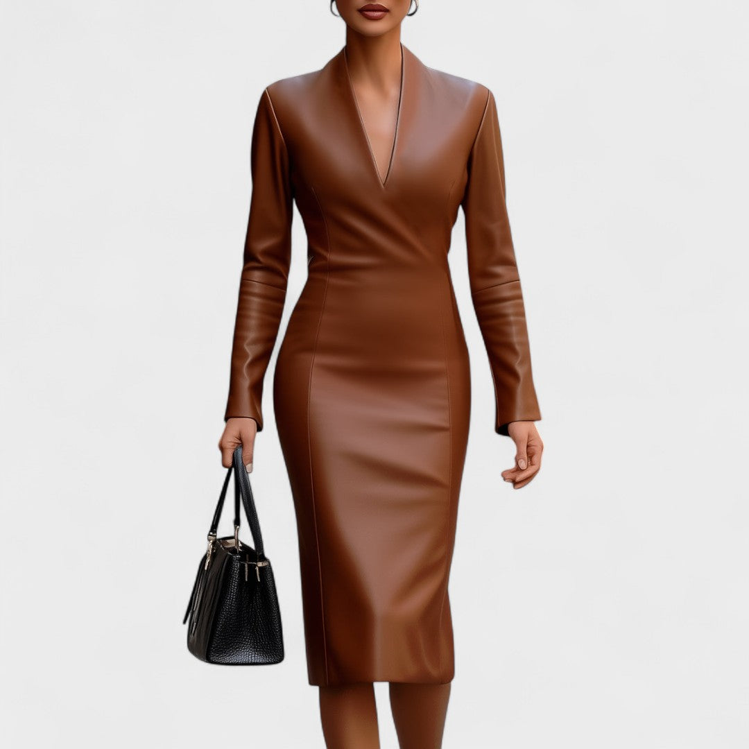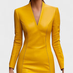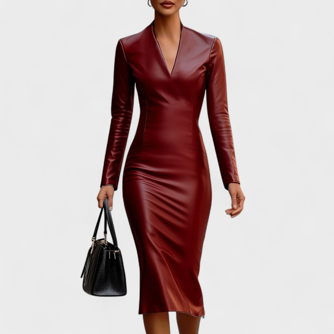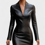 Тази тясна рокля от изкуствена кожа е перфектният избор за жени, които искат да подчертаят вашата увереност и изтънченост. Модерният крой, който следва линията на тялото, акцентира върху фигурата, докато материалът с висок блясък придава смел и луксозен вид. Идеален е за вечерни излизания, оценени събития или моменти, когато искате да оставите силно впечатление.