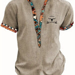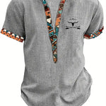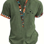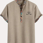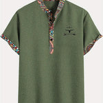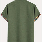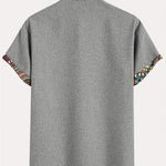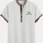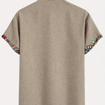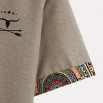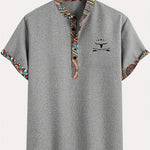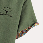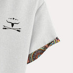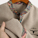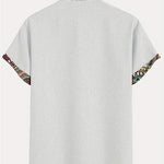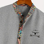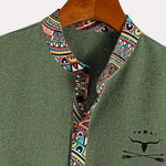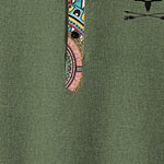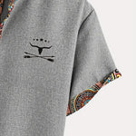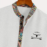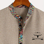 Манжетите и наследството на бутоните са украсени с геометрични мотиви, вдъхновени от племенното изкуство. Тези оригинални акценти повишават естетиката на ризата и добавят уникално измерение на вашия вид. Идеално за показване на изразителна личност в неформален стил.