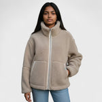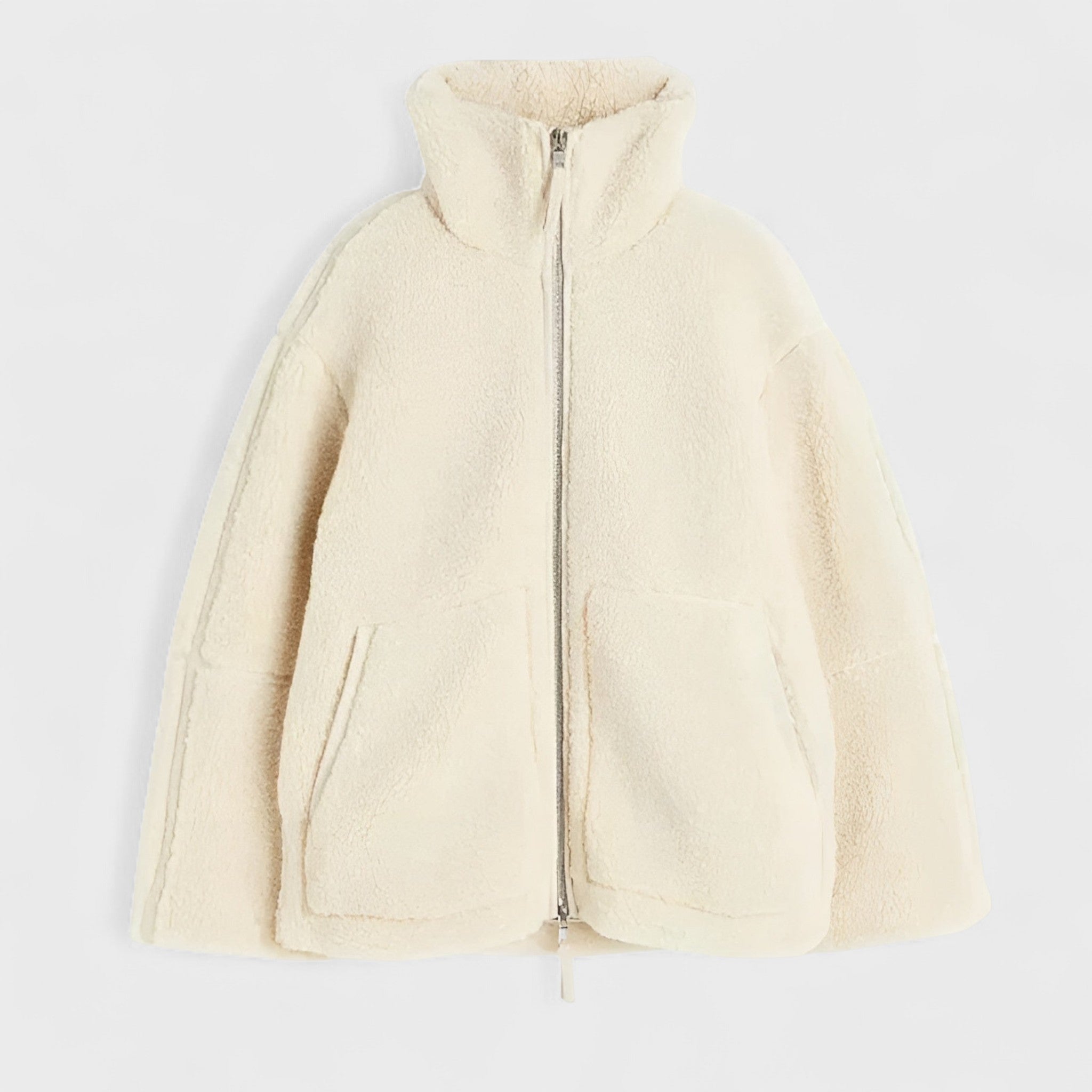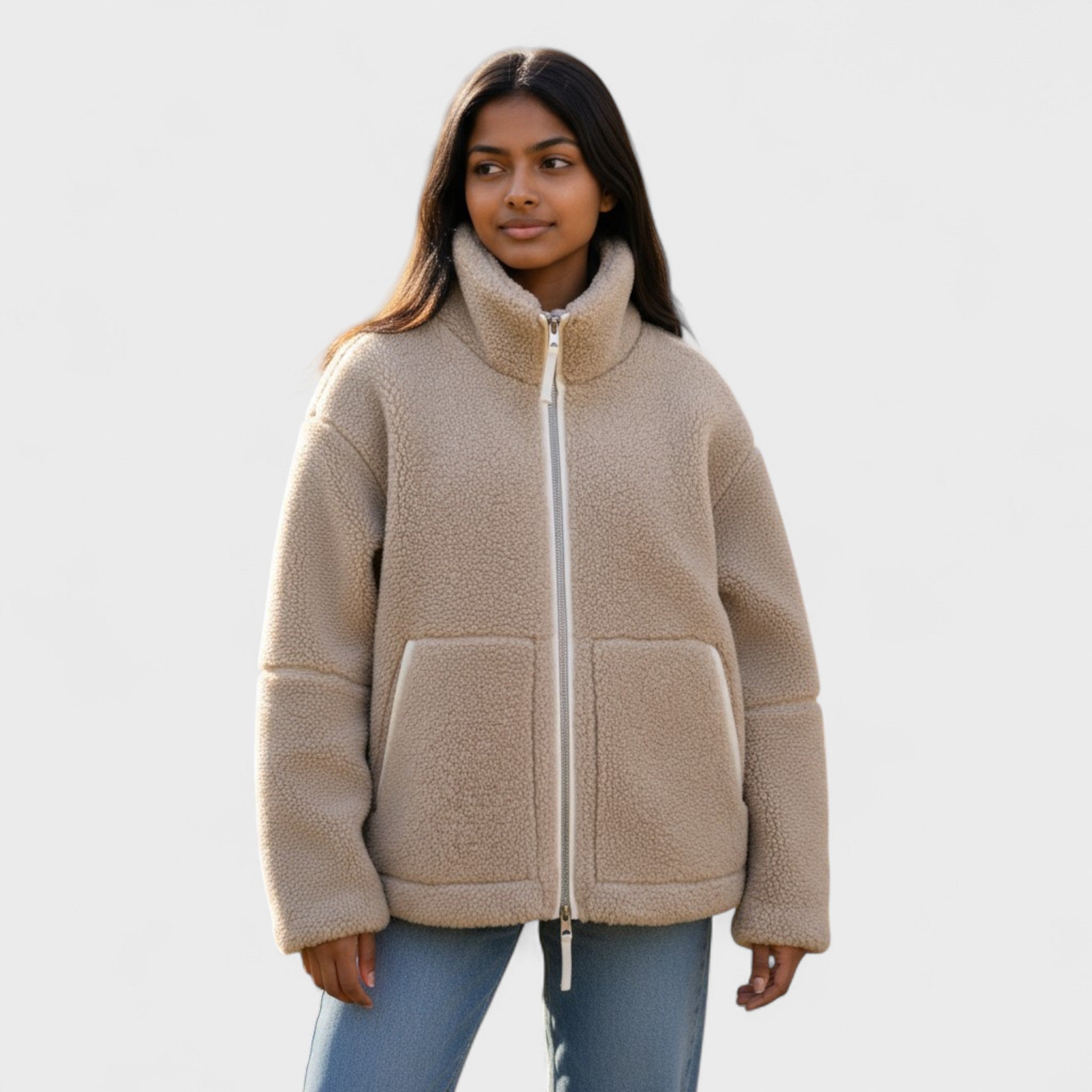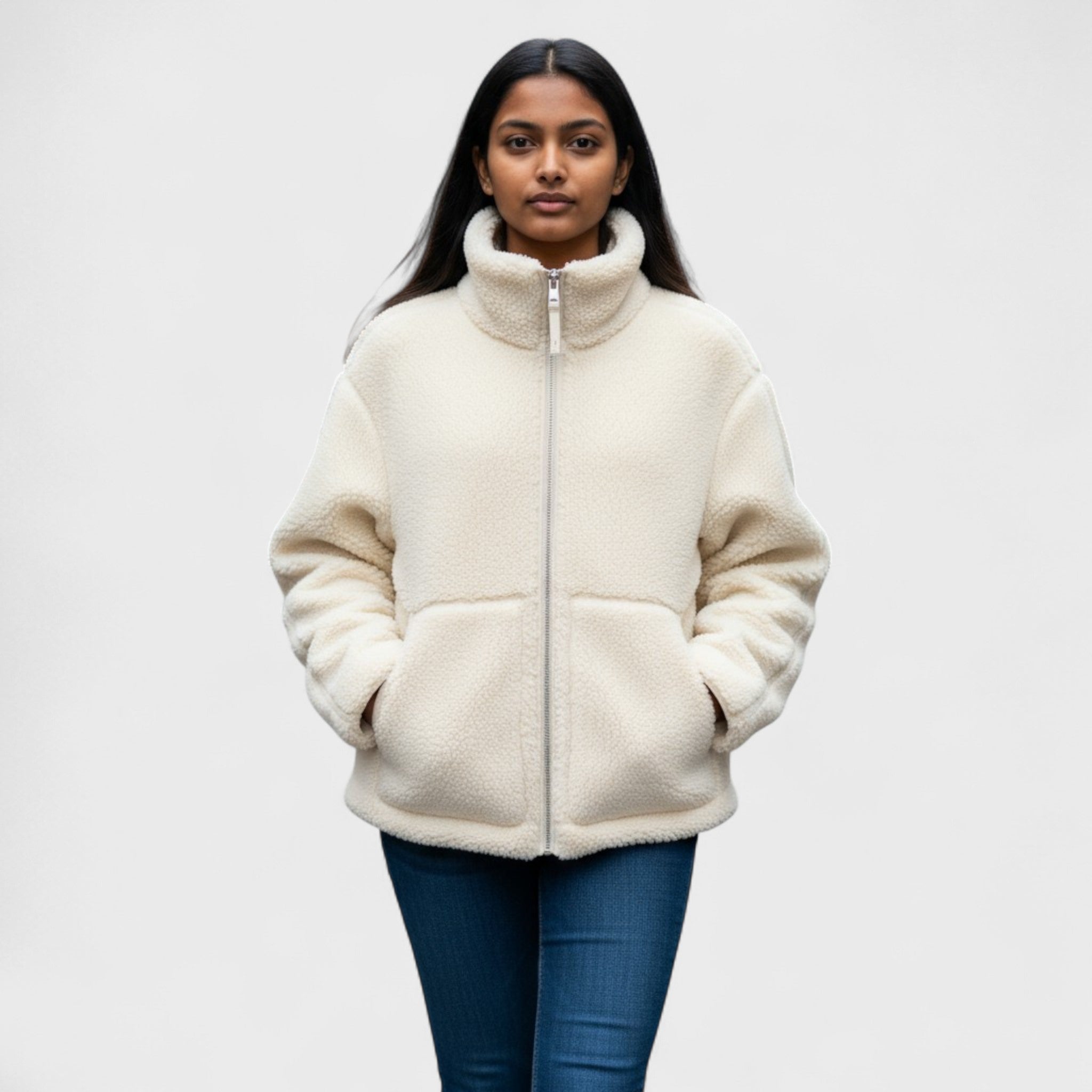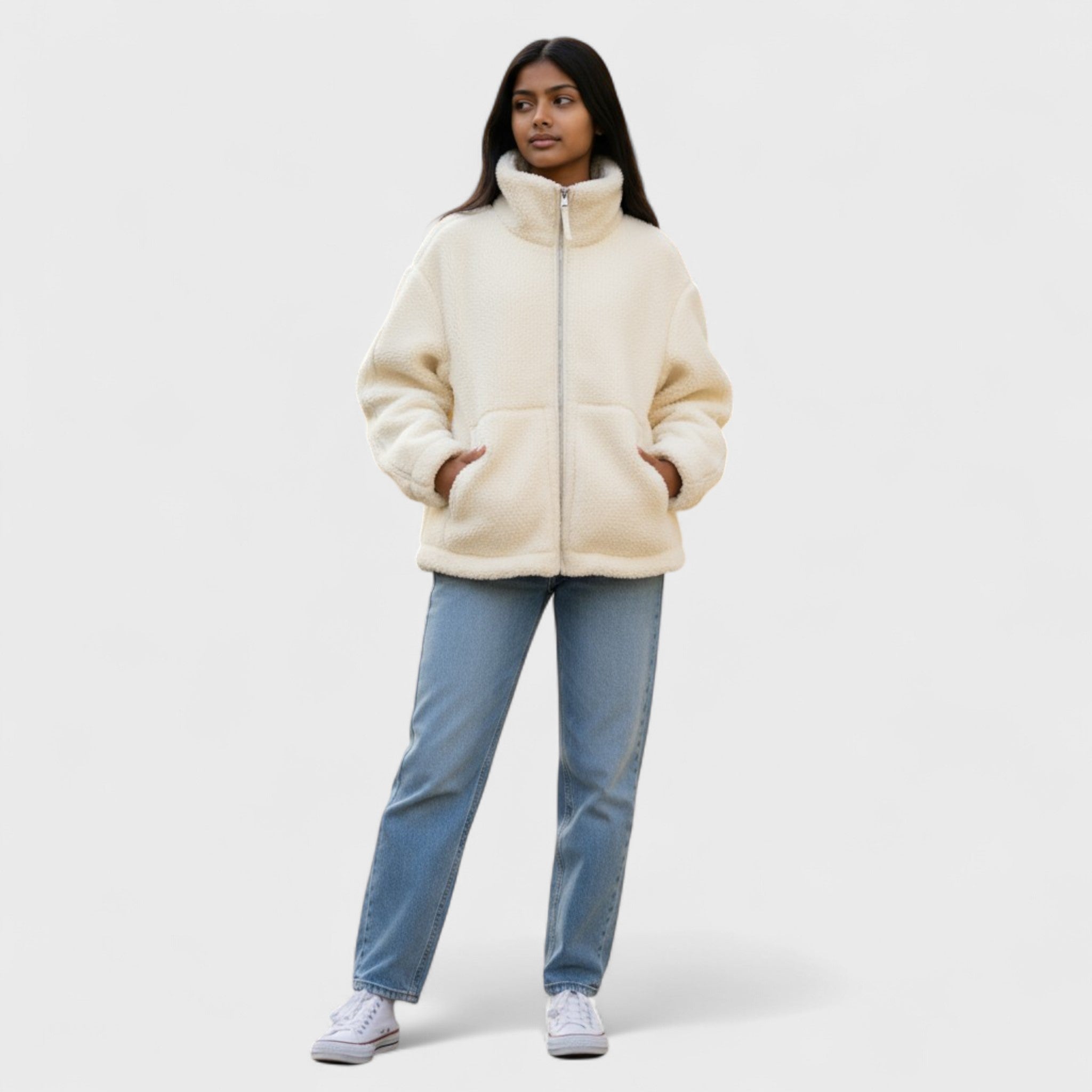 Плюшено яке с високо качество и цял цип за бързо обличане и регулиране на топлината. Свободна, комфортна кройка с паднало рамо и обем за лесно наслояване върху плетива и суичъри. Големи предни джобове побират телефон, ръкавици и дребни вещи, а меката флийс текстура дарява усещане за прегръдка всеки ден.