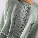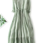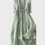 Тази проста и елегантна дълга рокля в нежно зелено оттенък излъчва свежест и естествена елегантност. С лек силует и свободен крой, нежно обвива тялото и предлага уникален комфорт през всеки момент от деня.