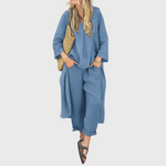 Този комплект от лек лен е перфектният избор за жени, които обичат комбинацията от елегантност и небрежност. Състои се от широки панталони, удобна блуза и дълго леко палто, което придава изисканост на ежедневния вид. Дишащият осигурява материал на лекарството при носене, а универсалният дизайн е идеален както за града, така и за почивка.