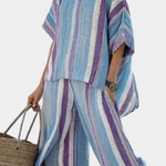Живописна свежест с цветна нежност. Комплект Daisy комбинира флуидна блуза и панталони с широки крачоли и вертикални райета, вдъхновени от Средиземно море. Нежните нюанси и леката текстура създават весела, удобна и динамична визия.