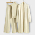 Този комплект от ребриста тъкан носи чист и модерен вид за по-хладните дни. Състои се от панталони с прав силует, безръкавна блуза с висока яка и дълго палто без копчета, предлагаща елегантност и комфорт в едно. Идеално за универсални комбинации, от домашния офис до по-неформални задължения с много чар.