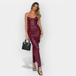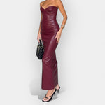 Тази рокля се отличава със своята смела характеристика и луксозна текстура на кожата. Идеална за изразителни появи, съчетава елегантност и динамика във всяка своя линия.