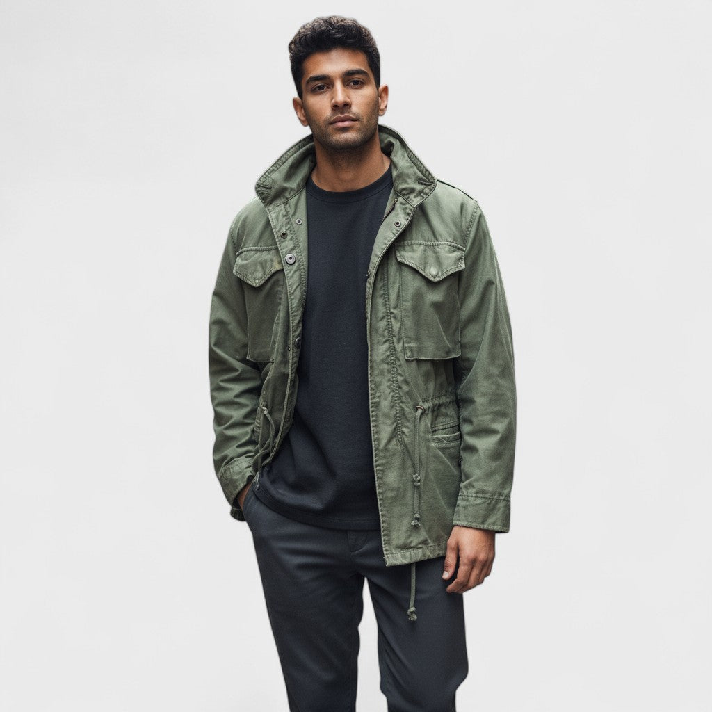Насладете се на безупречна комбинация от функционалност и елегантност със Стефан – Класическо мъжко яке с военен дизайн . Създаден по модела на малкото полеви якета, този модел съчетава устойчивост и удобство, като се придава на всеки тоалет мъжествено излъчване. Благодарение на практичните джобове, регулираната талия и стабилната яка, това е идеалният избор както за градския стил, така и за приключения сред природата.