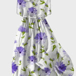 Тази елегантна макси рокля с бяла основа и лилави цветове излъчва свежест и женственост. Леката материя и проветливият крой са идеални за вашите пролетни и летни визии.